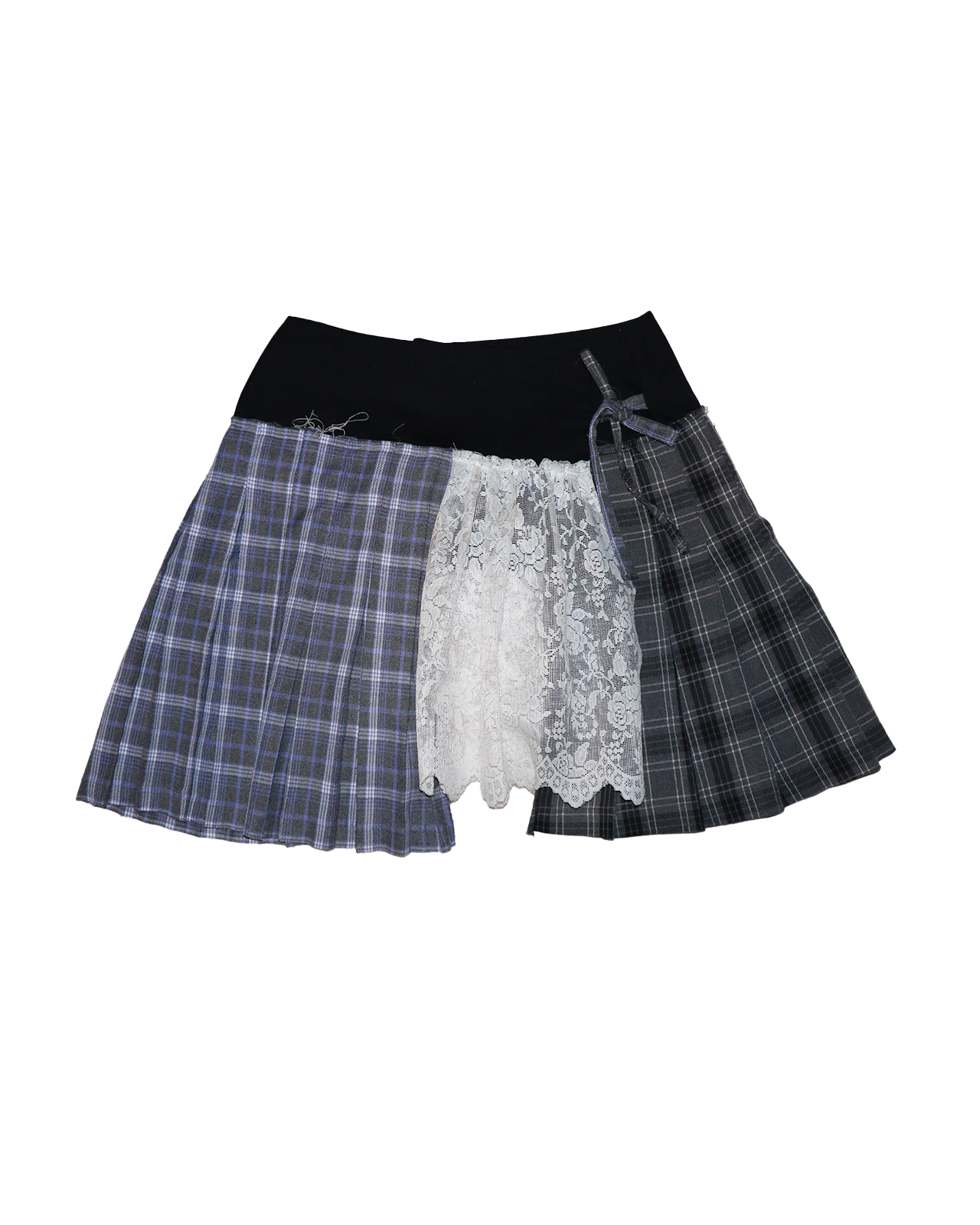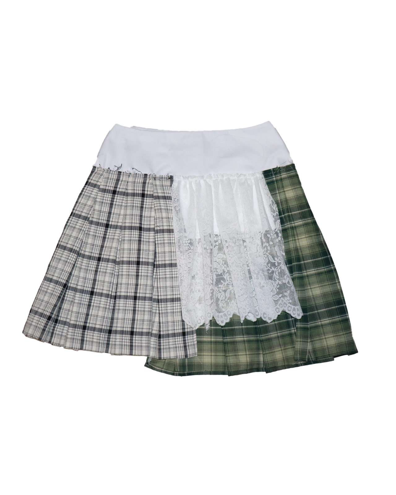 The Aileen Skirt is an upcycled, one-of-a-kind pleated mini skirt, handcrafted by combining contrasting tartans with a central lace insert.