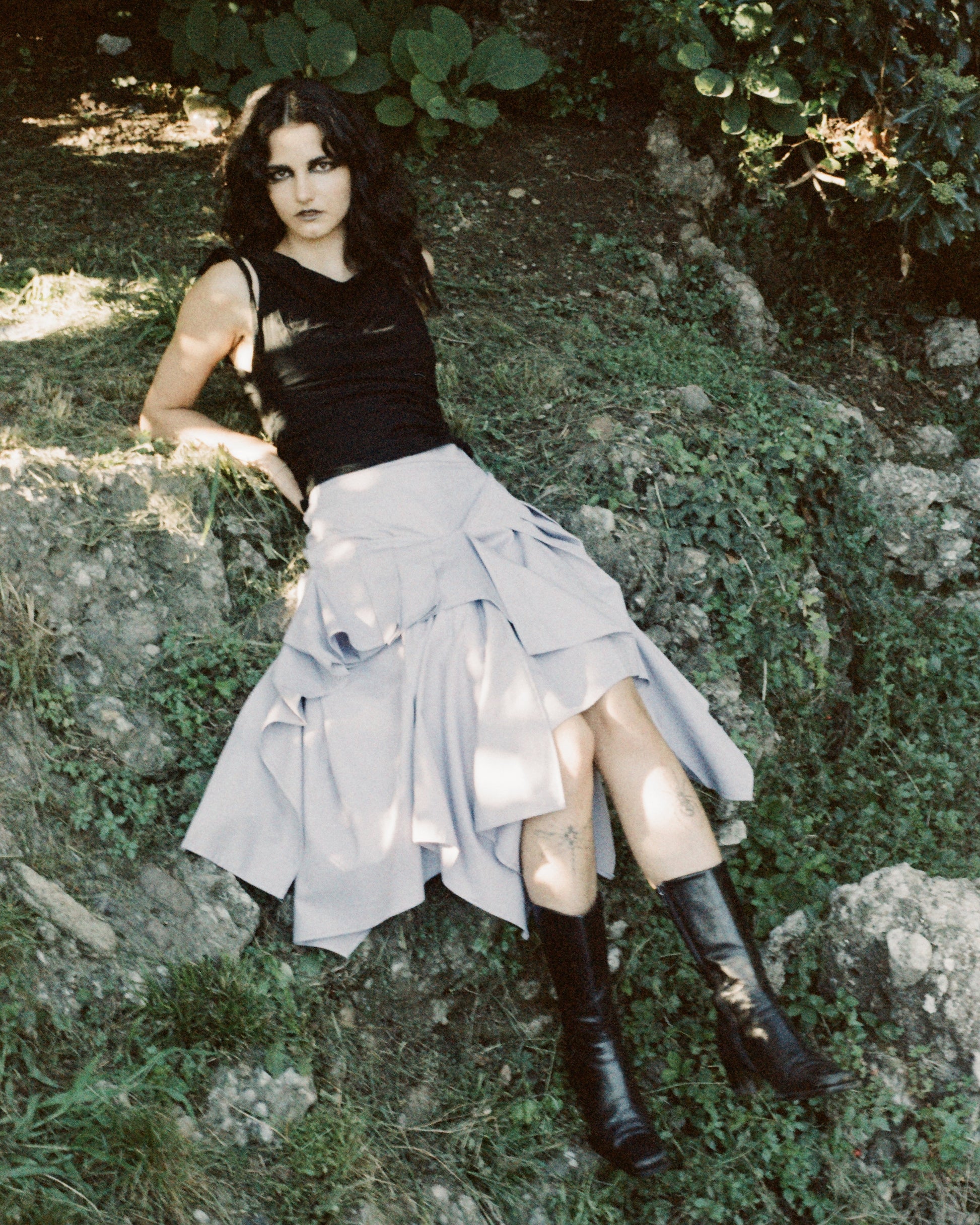 Each panel is individually placed and folded, creating shifts in movement and volume as the skirt flows around the body.